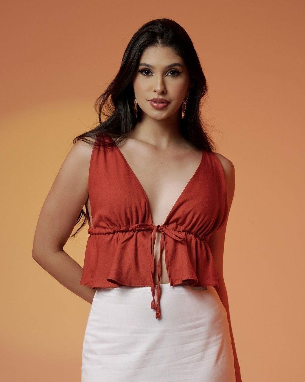 O Top Sicília vai deixar seus looks ainda mais femininos e cheios de personalidade. Fica liindo com a nossa Saia Longuete Boho ou com o Short-saia de babados viu?