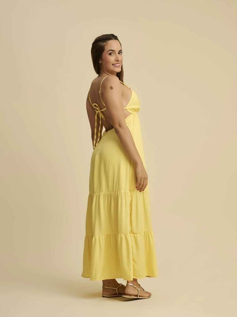 Com busto com decote na medida certa e alças finas, ele valoriza o colo com delicadeza. A parte de trás possui costas abertas com amarração dupla, permitindo ajuste perfeito e adicionando charme ao visual. A saia longa em camadas garante fluidez extra e um toque romântico.